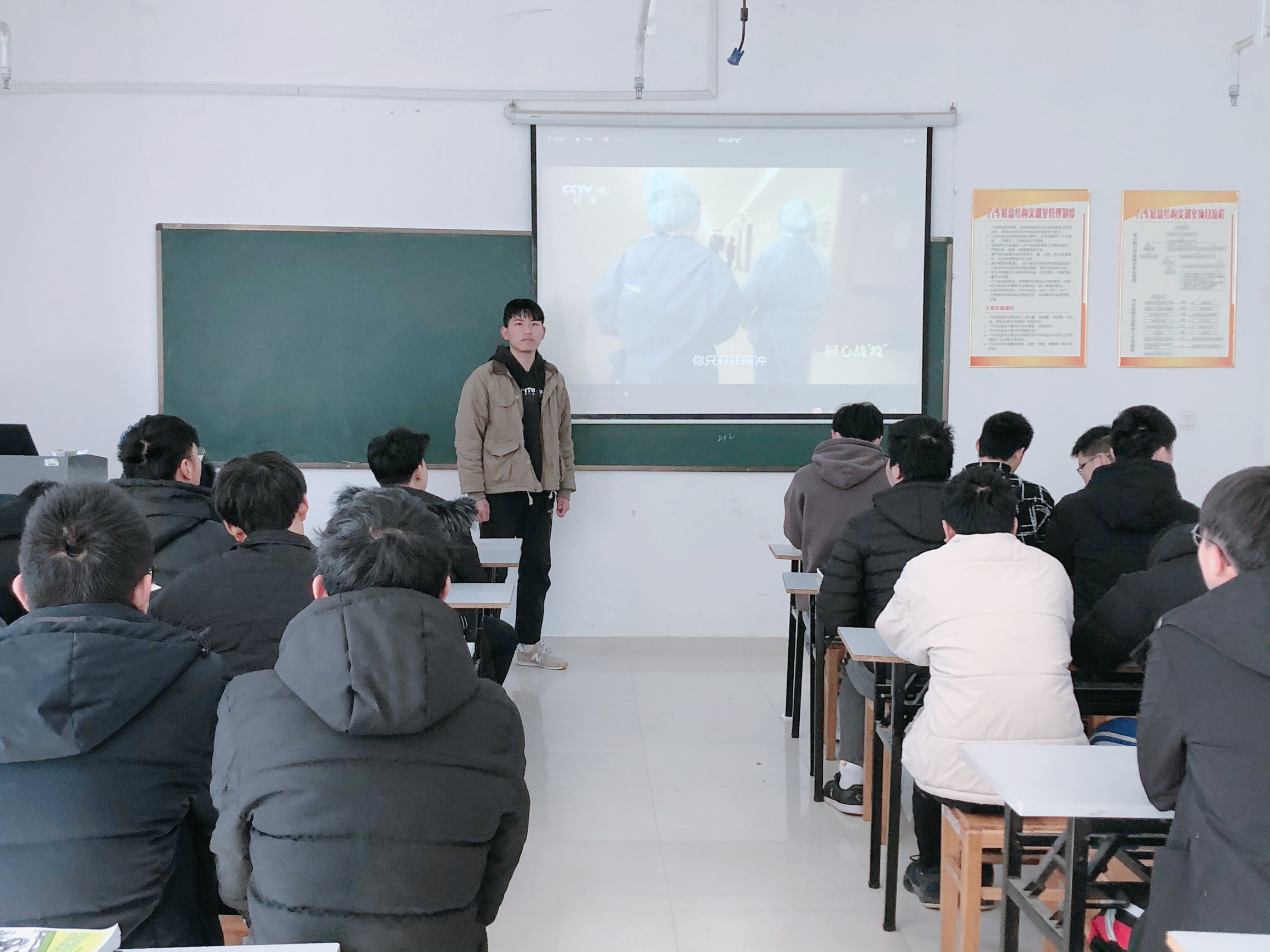 专业教育结束后,大家一起观看《同心战“疫”》纪录片,感受伟大抗疫精神的深刻内涵,接受爱国主义教育。新生代表夏俊枫表示:“在战疫英雄事迹的感召下,今后将学好专业,积极承担社会责任。 砥砺强国之志,力践报国之行!”