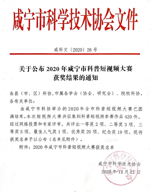 太阳成集团tyc122cc智能装备系作品在咸宁市科普短视频大赛中获奖