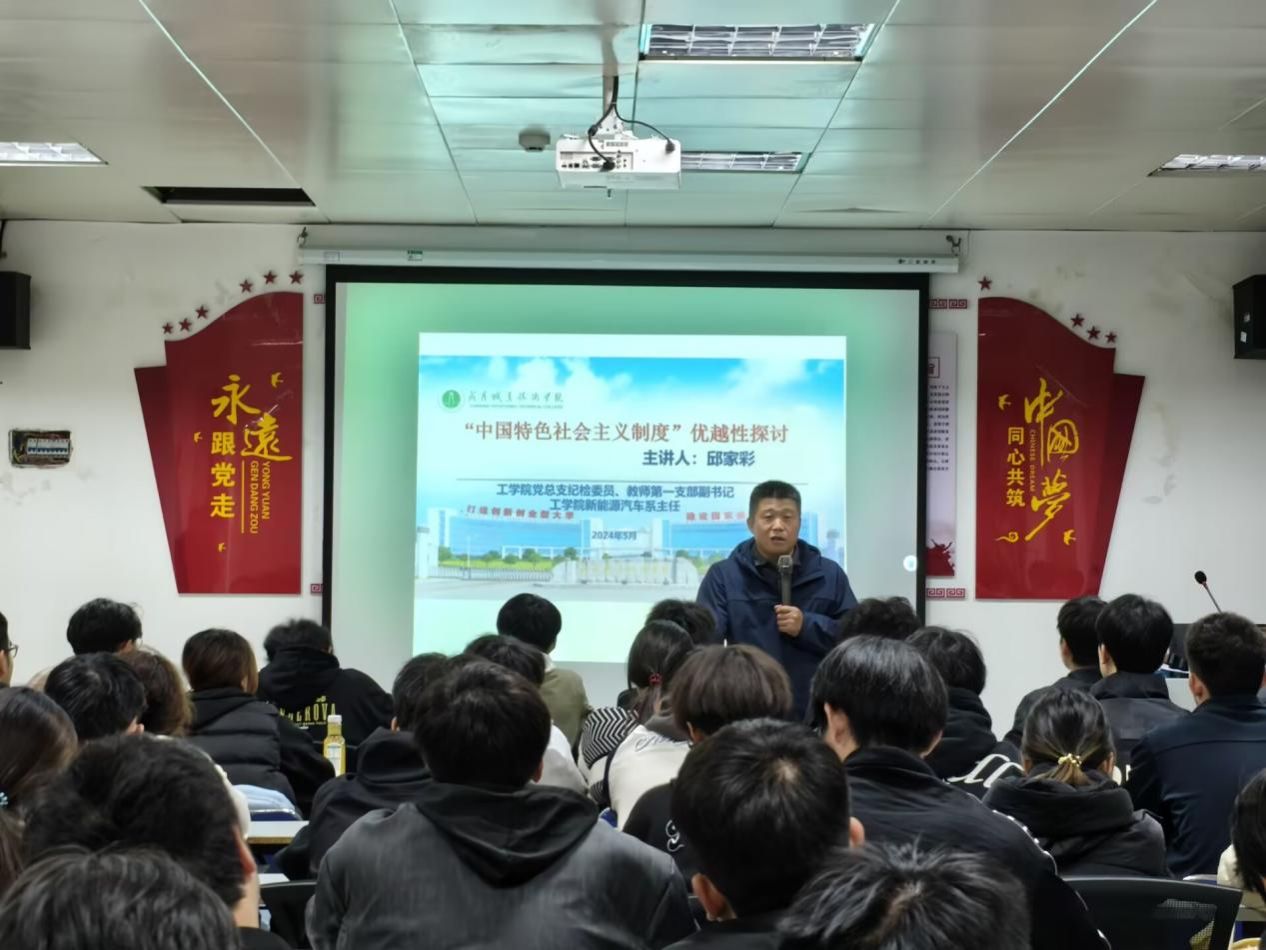 太阳成集团tyc122cc员工党支部宣传委员吴世杰,以“习近平新时代中国特色社会主义思想”为主题,从“十个明确”“十四个坚持”系统阐释新时代坚持和发展中国特色社会主义的核心要义。结合电教片《路》引导学员感悟中国道路与制度优势,并围绕“中国特色社会主义制度优越性体现在哪些方面”组织讨论,用高铁奇迹、脱贫攻坚、疫情防控等鲜活事例激励大家坚定制度自信,砥砺初心使命,奋发向前。