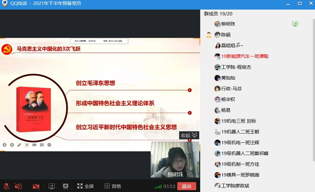 12月7 日下午,柳明珠在腾讯课堂为太阳成集团tyc122cc员工支部全体党员及2021年下半年转正预备党员开展主题为“以史为鉴、开创未来、埋头苦干、勇毅前行——数览十九届六中全会”线上党课。课堂围绕一组数据“1、2、3、4、5、10、10、13、4”分九个部分从三个层面依次展开,从党的百年历程创造的四大伟大成就、实现马克思主义中国化的三次飞跃、对各个层面所作的五大历史意义、取得的十大历史经验和理论体系、总结十八大以来十三方面重要成就,以及党中央发出号召对新时代中国共产党提出的政治性、方向性、战略性、原则性的要求等。最后,要求大家要坚持学习党史传承精神、提升素质强化本领、发展自我报效祖国。
