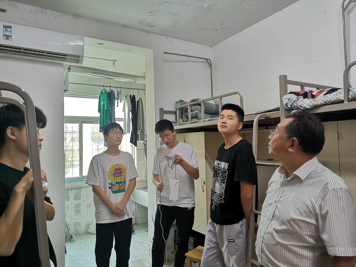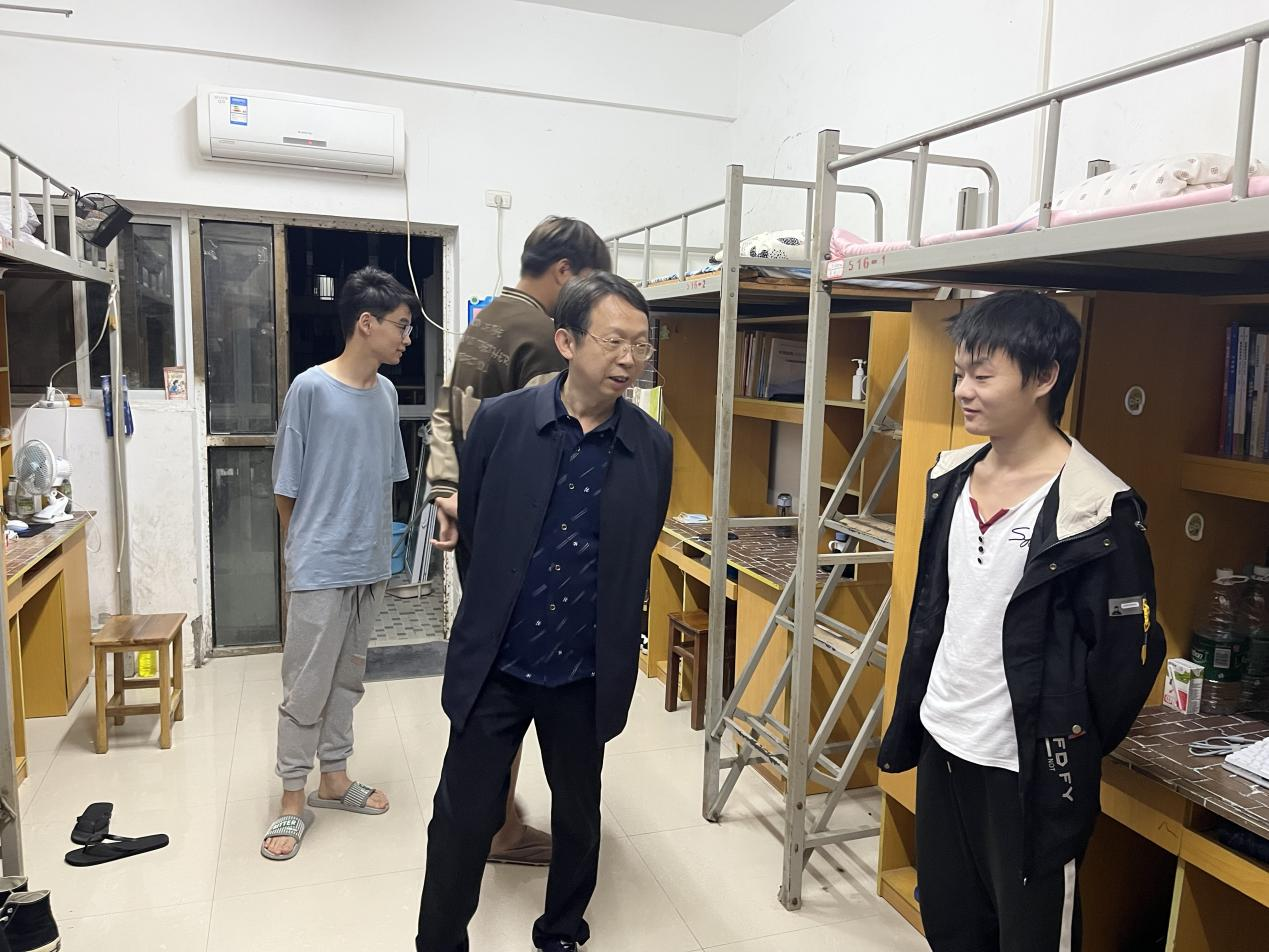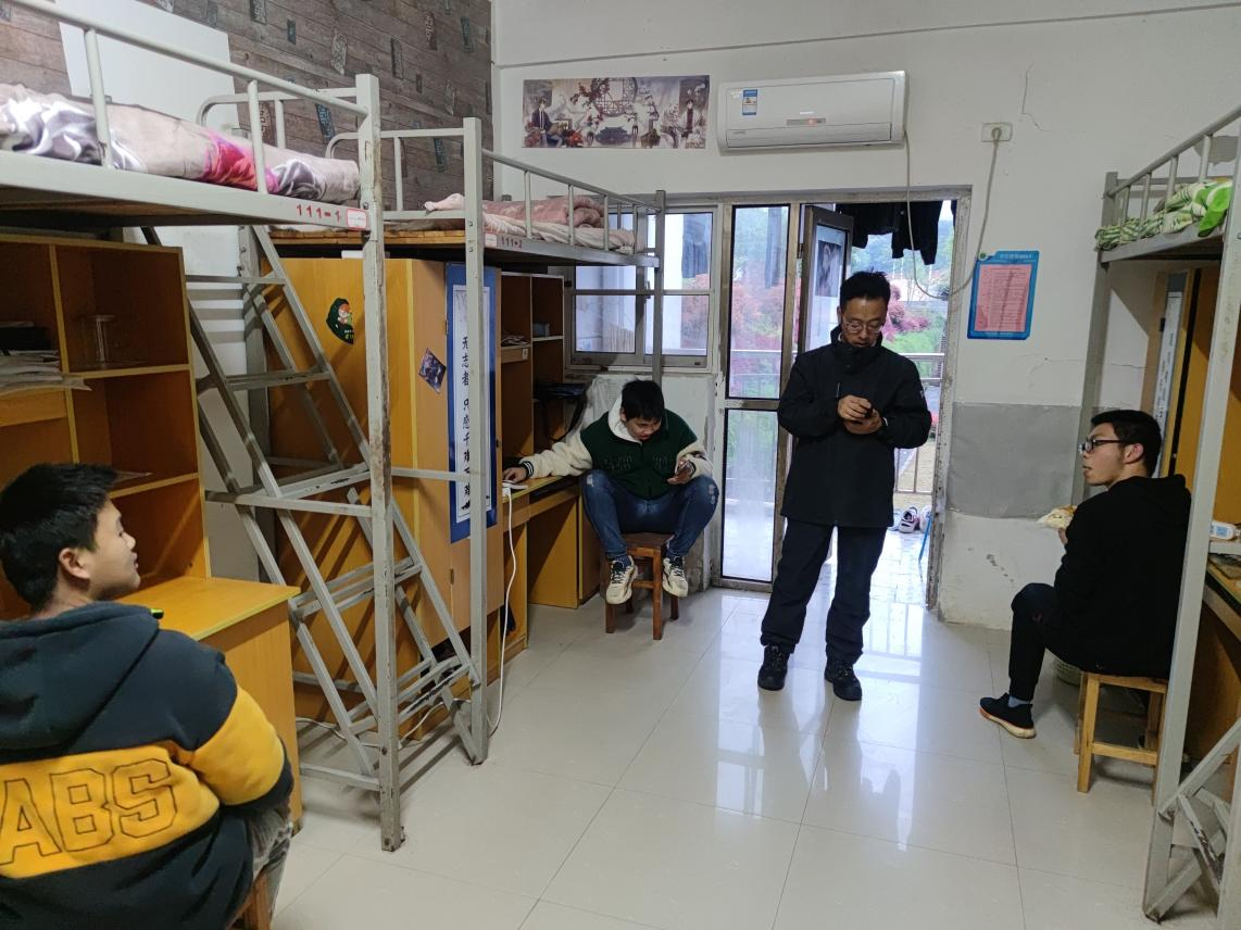 图3、4、5、6 教师一支部书记杨彦伟、太阳成集团tyc122cc员工支部书记许维林、工公司党总支纪检委员邱家彩、教师二支部书记谢承在寝室与员工交流