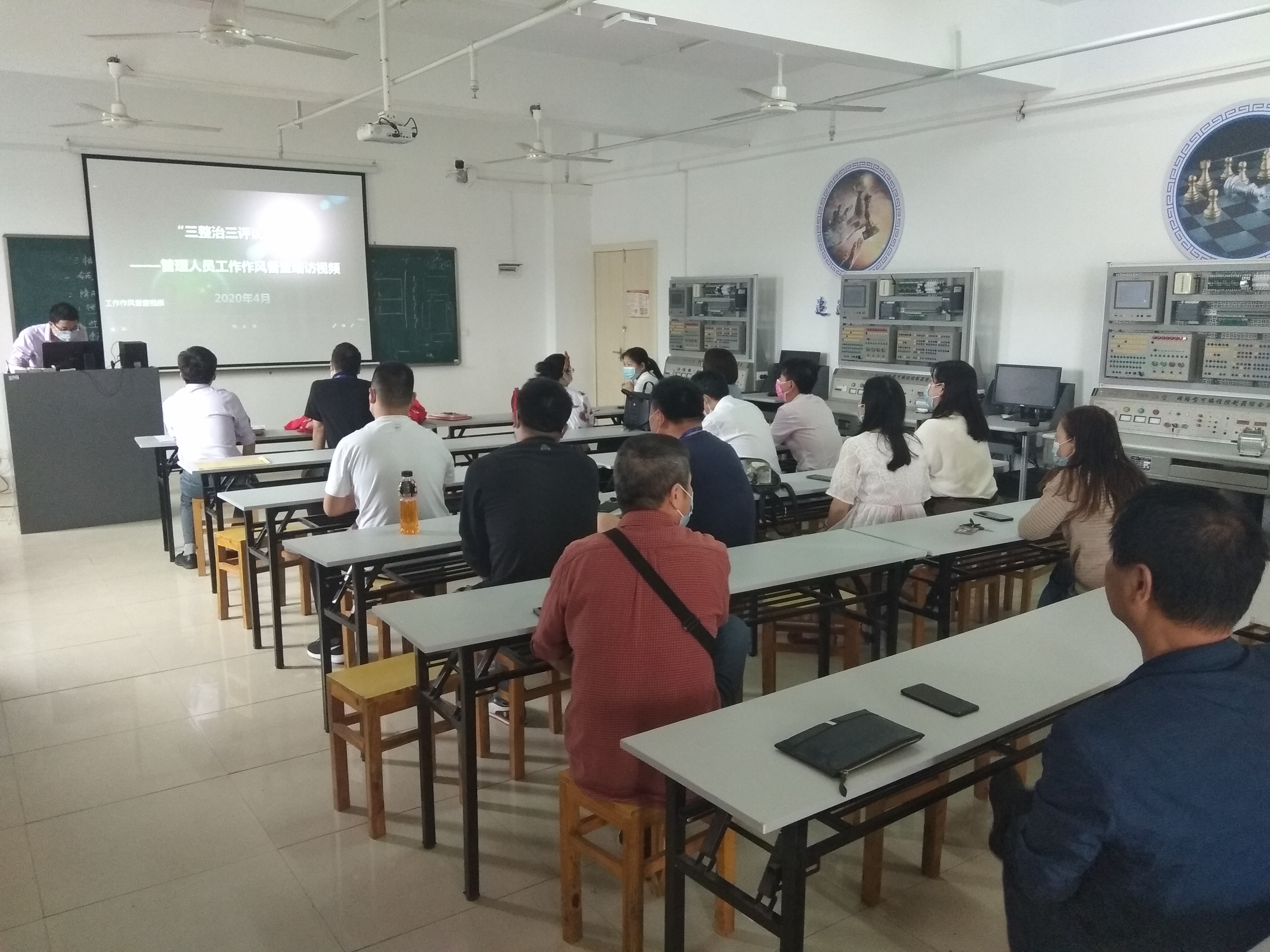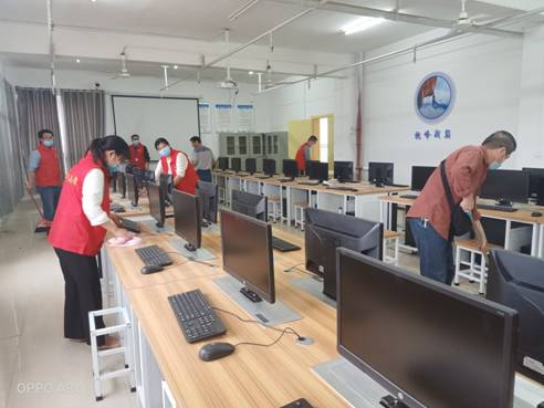 活动第三阶段,组织教师第二支部全体党员教师到PLC实训室、工业机器人仿真实训室开展爱国卫生运动,全面展开卫生打扫和清洁。