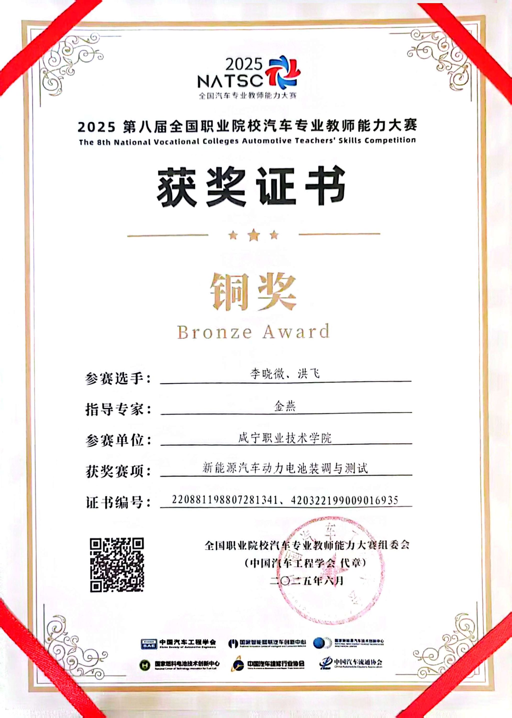 6月16日,第八届全国职业院校汽车专业教师能力大赛在荆州职业技术公司闭幕。公司新能源汽车教学团队洪飞、李晓微教师凭借扎实的专业功底与出色的现场表现,在众多选手中脱颖而出,荣获铜奖。
