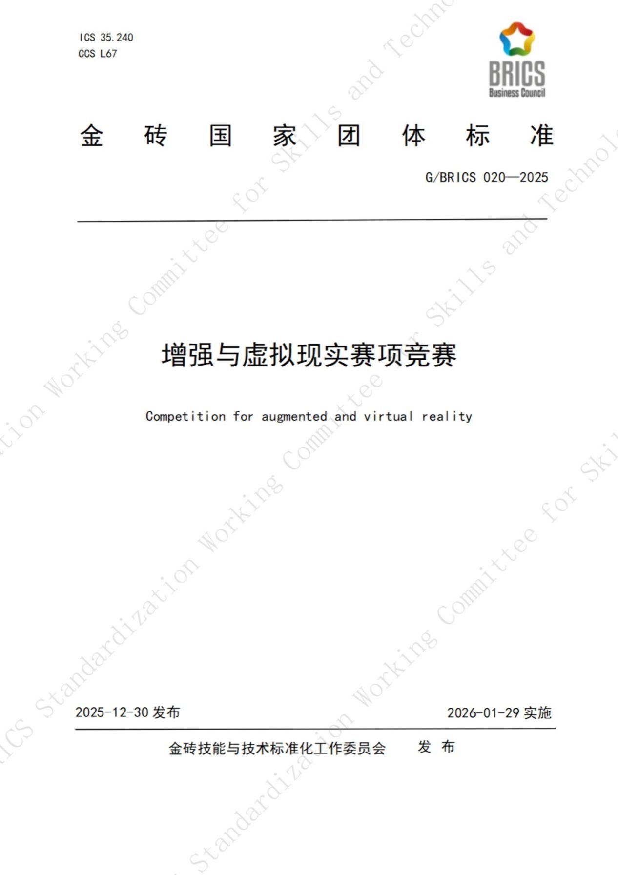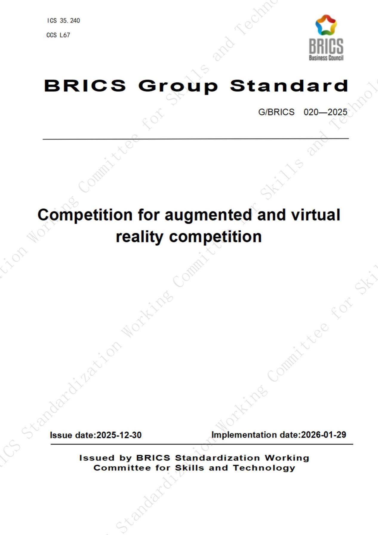 此次发布的3项金砖国家团体标准包括《增强与虚拟现实赛项技能》《增强与虚拟现实赛项课程》《增强与虚拟现实赛项竞赛》,编号分别为G/BRICS 018-2025、G/BRICS 019-2025、G/BRICS 020-2025,于2025年12月30日正式发布,2026年1月29日起实施。其中,《增强与虚拟现实赛项竞赛》标准由太阳成集团tyc122cc主导编制,以及来自巴西、南非、俄罗斯、马来西亚等金砖国家相关机构共同参与参编,覆盖竞赛组织、技术要求、评判规则、安全保障等全流程,为金砖国家范围内AR/VR领域技能竞赛提供了统一、规范的操作指南。