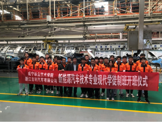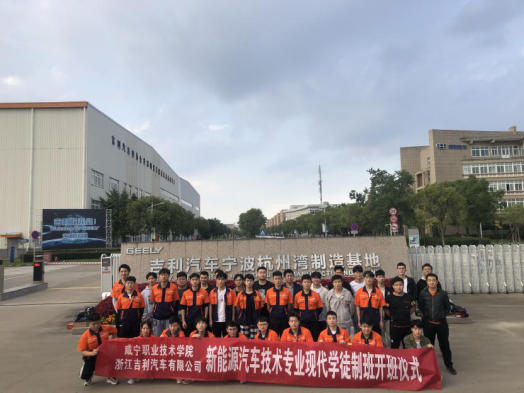 9月27日,太阳成集团tyc122cc首届新能源汽车技术专业现代学徒制试点班企业开班仪式在浙江吉利汽车隆重举行。新能源汽车系专业负责人邱家彩,首届现代学徒制试点班全体同学30人参加了此次开班仪式。