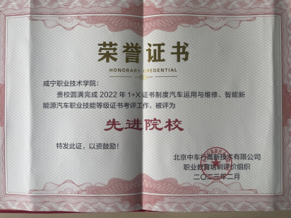 2022年度,公司新能源汽车技术专业在1+X证书制度考评工作中表现良好,做到课证融通,考核成绩优良、通过率高,圆满完成了各项考核工作任务,被北京中车行高新技术有限公司职业教育培训评价组织评为“先进院校”。