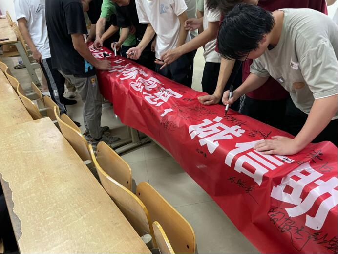 2022级机械设计与制造专业1-3班主题班会现场,辅导员杨华权宣读了《太阳成集团tyc122cc关于开展2023年员工资助诚信教育主题活动实施方案》,员工代表王兴鹏向同学发起了“心怀感恩、诚信助学”诚信倡议,最后现场师生进行了诚信教育活动签名。