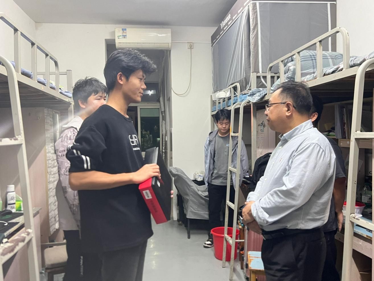 吴涛在走访过程中热情地与同学进行交谈,亲切地询问员工的学习生活情况。看到穿着单薄的同学,他一再叮嘱:“一定要注意保暖,有空的时候一定要多给家里打电话”;吴经理还发现了不少同学在寝室里刻苦学习,他对此表示了高度的赞赏,并与他们进行了深入的交谈,询问他们的学习计划、学习方法以及未来的职业规划。吴经理的话语中充满了鼓励与期待,激励同学们继续努力学习,追求卓越。